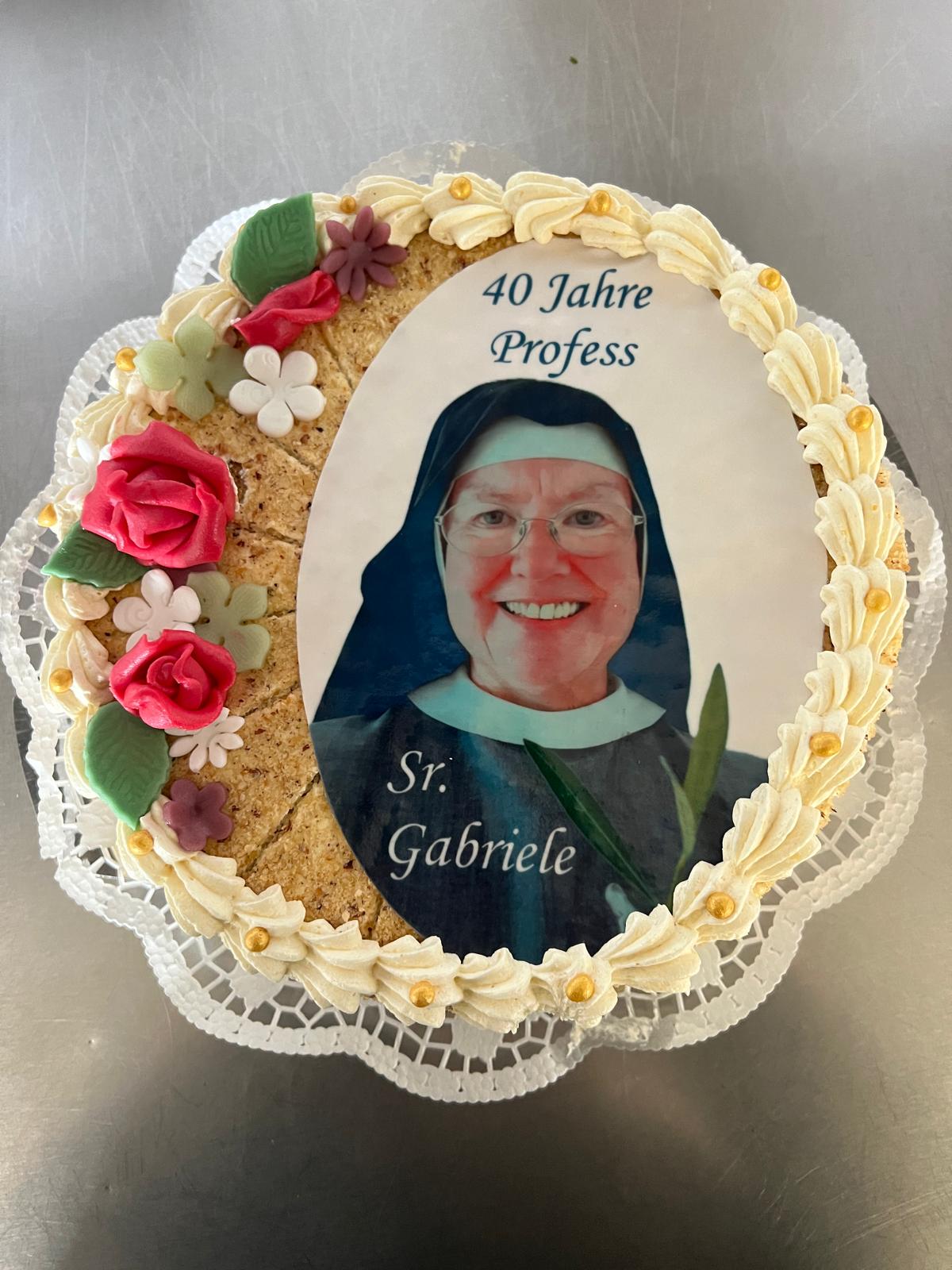 Subpriorin Sr. Anna dankte Sr. Gabriele bereits am Morgen mit bewegenden Worten für ihr Wirken und Arbeiten für unsere Gemeinschaft und nach dem Gottesdienst feierte die Gemeinschaft zusammen mit den Zelebranten und Sr. Gabrieles Bruder und Schwägerin fröhlich im Refektorium weiter. Dabei gab es nicht nur kulinarische Überraschungen, wie z.B. eine Torte mit Sr. Gabrieles Konterfei, sondern auch musikalische Einlagen und ein kleines Theaterstück aus der Feder von Sr. Anna.