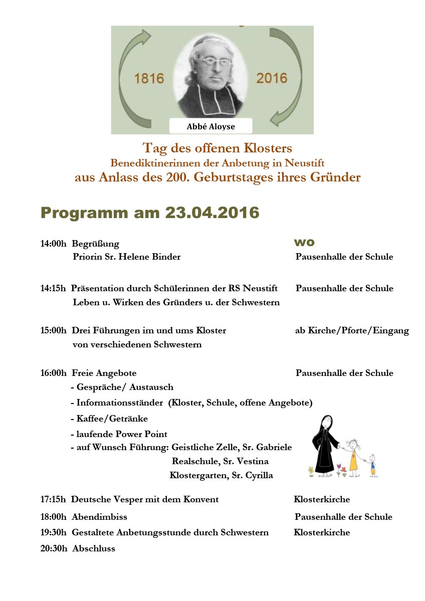 Nutzten Sie die Gelegenheit sich im Kloster der Benediktinerinnen in Neustift über das Leben und Wirken der Schwestern zu informieren. Wir laden Sie ein, aus Anlass des 200. Geburtstages unseres Gründers,mit uns zu beten, zu essen, zu singen und beisammen zu sein. Wir freuen uns auf Ihr Kommen!